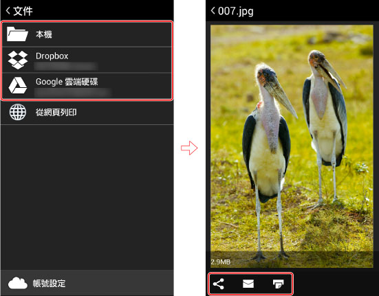 您可在行動裝置中,將已掃描/已擷取資料或檔案當成本機文件來管理。您也可以將其上傳至應用程式支援的雲端儲存、以電子郵件發送或列印出。