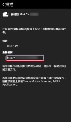 [主機名稱]:輸入在 Canon PRINT Business 的 [掃描] 畫面中顯示的主機名稱。